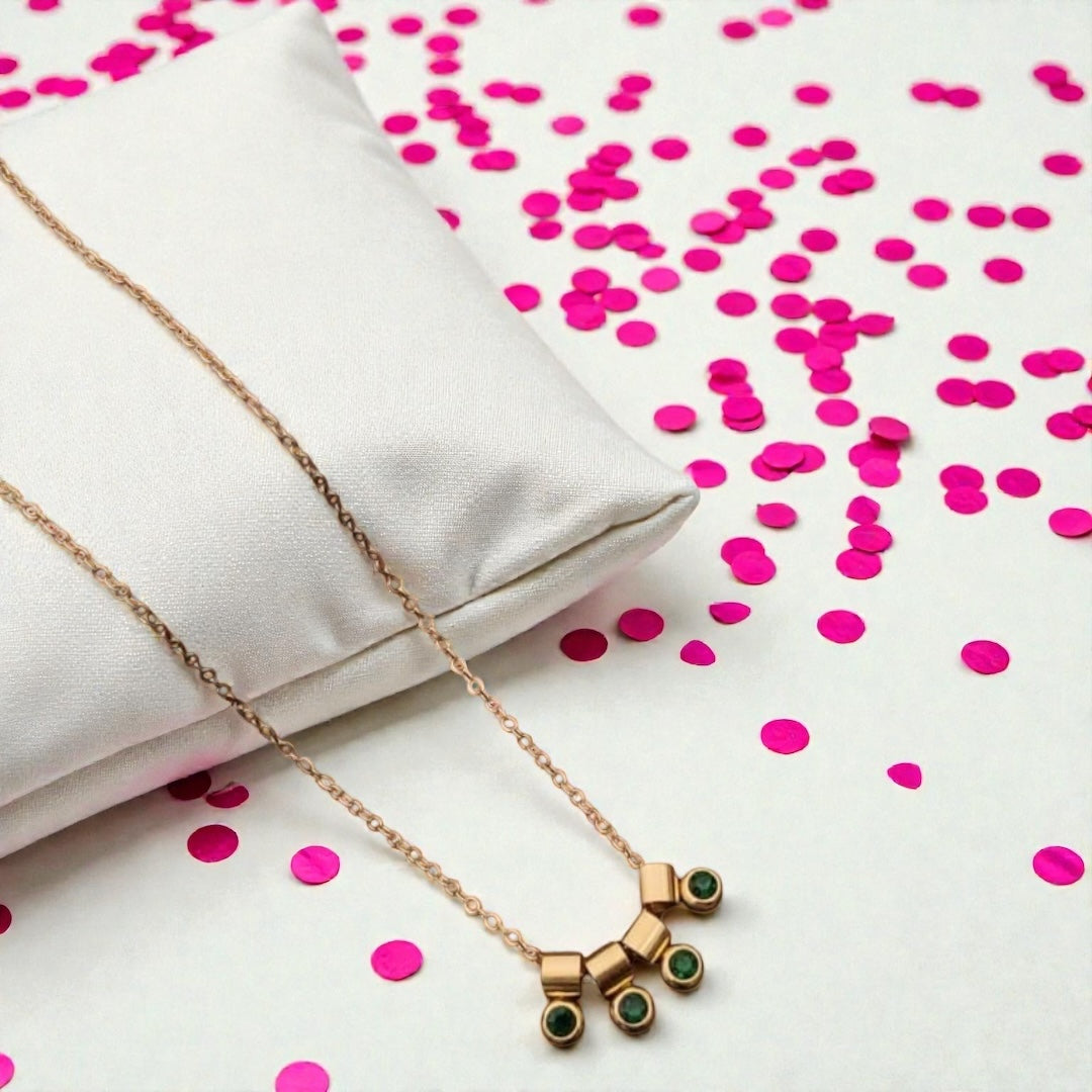 ✨ Een ketting die moderne sprankeling combineert met tijdloze elegantie. Verguld met stralend 18-karaats goud, is dit sieraad voorzien van drie levendige groene kristallen druppels die een verfijnde kleuraccent en een vleugje luxe toevoegen aan elke look.