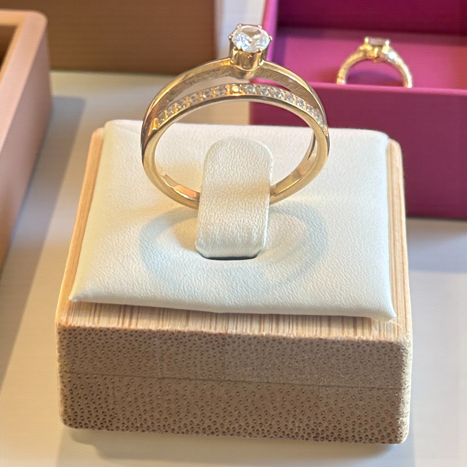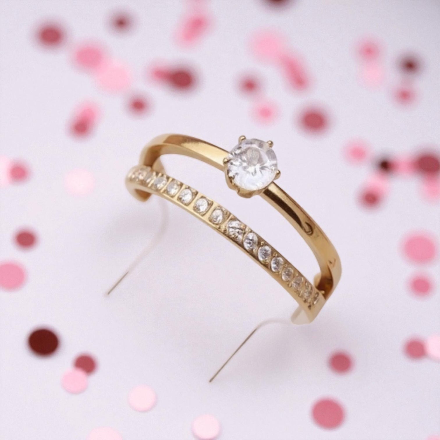 This stunning ring features a brilliant round-cut crystal centerpiece set in lustrous 18K gold plating. The band is delicately lined with smaller crystals, creating a perfect balance of sparkle and sophistication.
