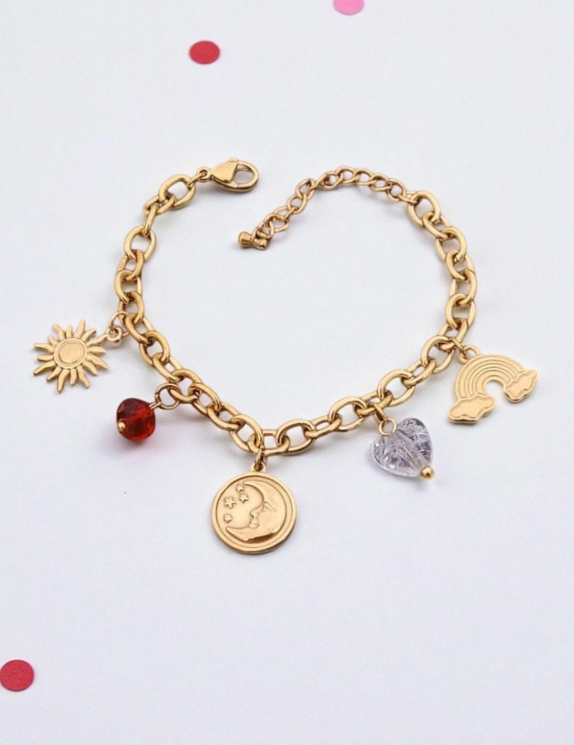✨ A bold charm bracelet featuring a mix of celestial motifs, vintage-style coins, and soft pastel accents.