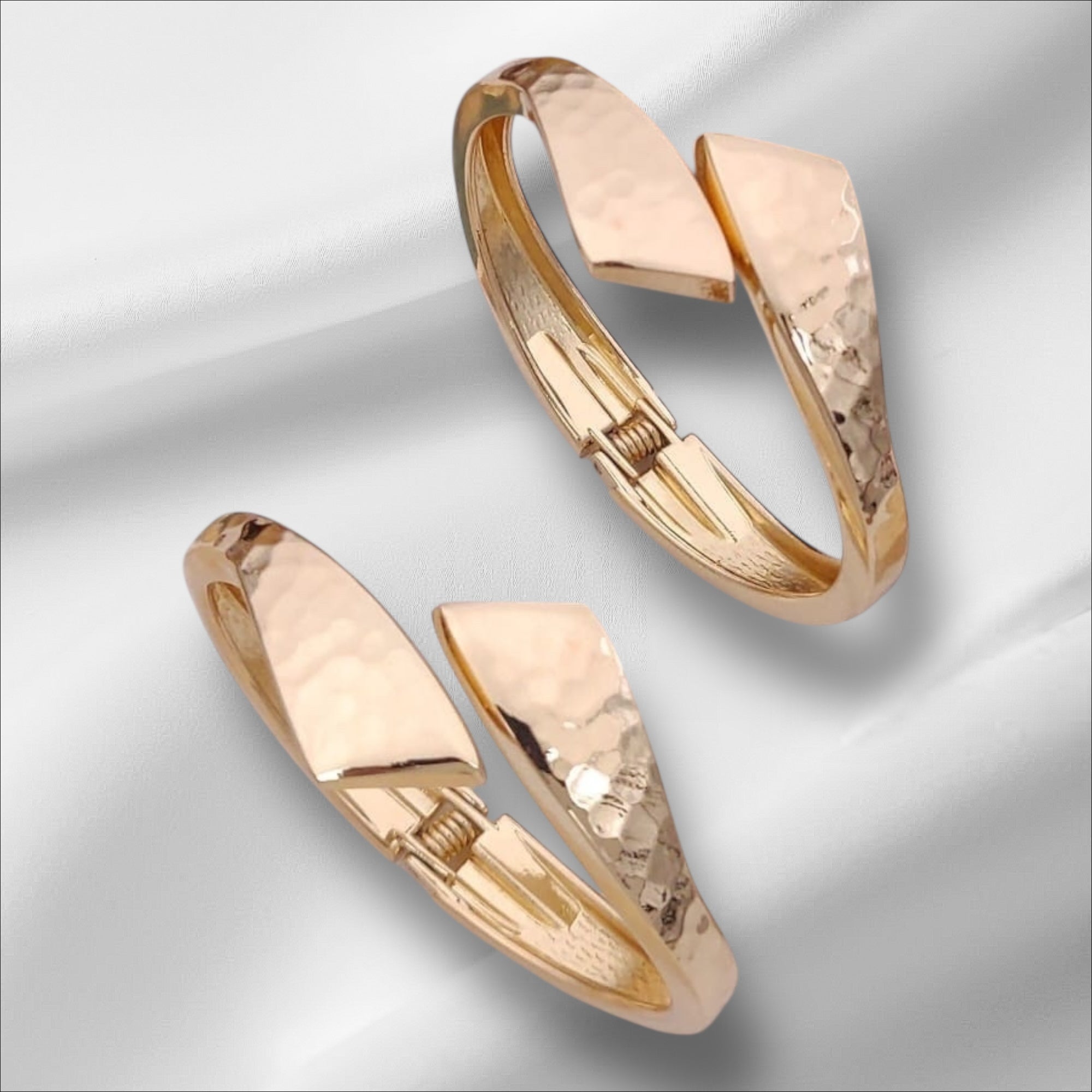 This V-shaped bangle features a polished gold base with a hammered shine that catches the light beautifully. Its modern pointed silhouette gives a chic, elevated look — perfect for anyone who loves statement minimalism.