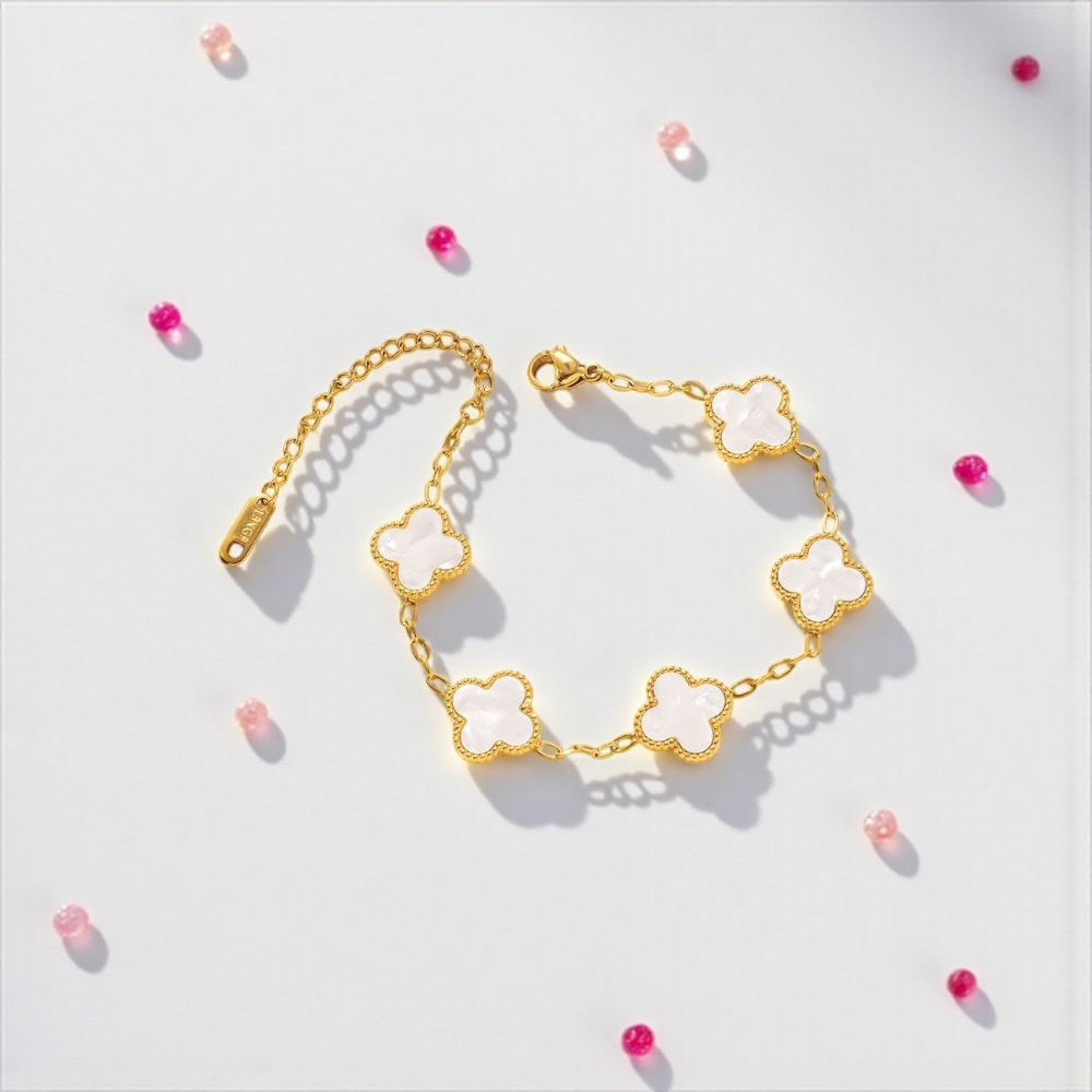 ✨ A soft and elegant bracelet featuring four glossy white clover charms framed in polished gold.