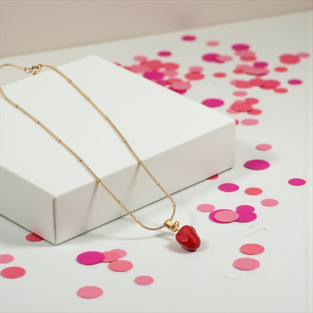 ✨ A fun and quirky necklace featuring a glossy red paprika charm for a playful, unique touch.