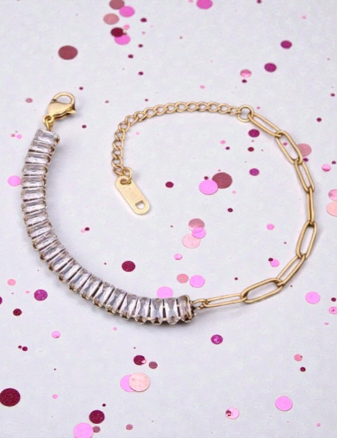 ✨ A chic modern bracelet blending a sparkling row of baguette-cut crystals with bold gold paperclip links.